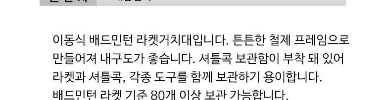 HOME > 학교스포츠 > 다우리 > 배드민턴라켓 거치대/라켓80개이상 보관/셔틀콕보관함 부착/115cm*60cm*100cm(h)/라켓진열대/색상랜덤/주문제작상품